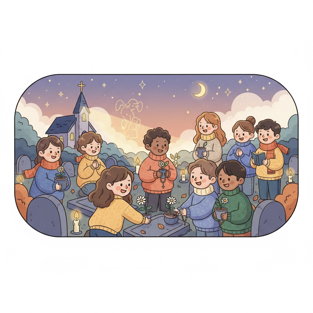 • 묘지 참배 지원 봉사: 11월 동안 거동이 불편하시거나 대중교통 이용이 어려운 어르신 신자들이 본당 공원묘지나 납골당을 방문하실 수 있도록 차량 지원이나 동행 봉사를 합니다. 청년들이 동행하며 묘지 주변 환경 정리를 돕고 함께 위령 기도를 바칠 수 있습니다.