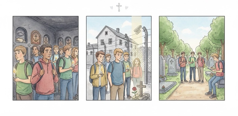 어두운 지하에서 청년들은 초기 교회의 용기와 믿음을 느낄 수 있습니다. 죽음이 끝이 아닌 부활과 영원한 생명으로 가는 길임을 묵상합니다.